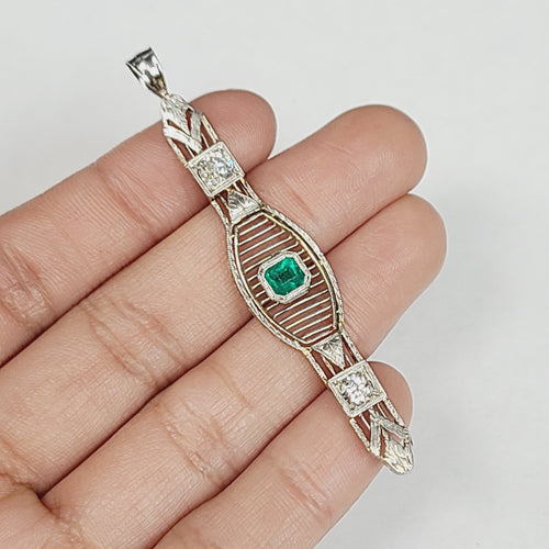 Art Deco Emerald and Diamond 14K White Gold Bar Pin Pendant