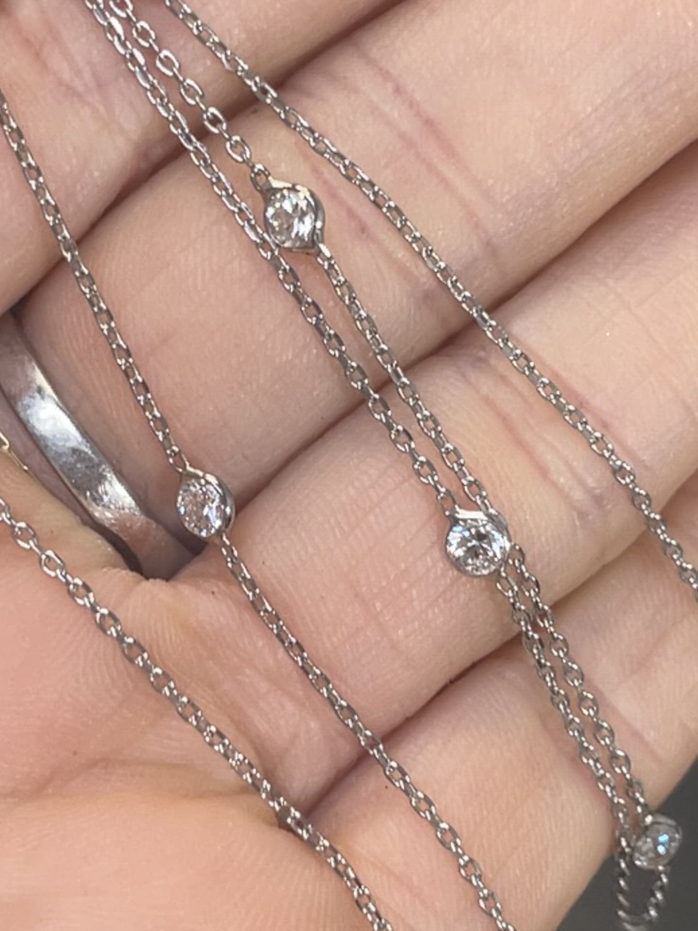 Featuring 9 round brilliant cut diamonds bezel set in 14K white gold on an 20” cable chain.