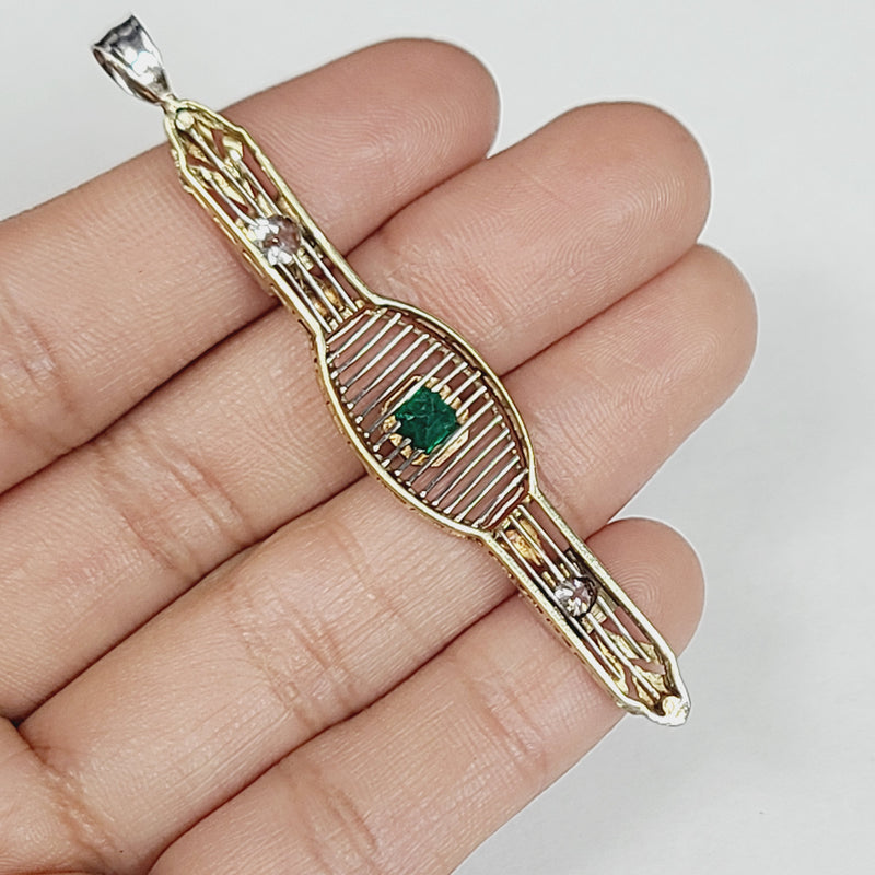 Art Deco Emerald and Diamond 14K White Gold Bar Pin Pendant Sale price$1,968.76