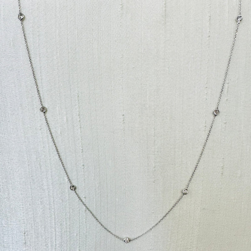 Indulge in the luxury of our 14K White Gold 18" Diamond By The Yard Necklace. Crafted with precision from the finest materials, this necklace features shimmering diamonds that elegantly adorn your neckline. Elevate any outfit and make a statement with this exclusive and sophisticated piece.