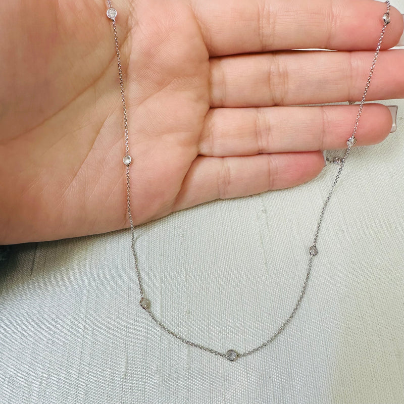 This 14K White Gold 28" Diamond By The Yard necklace weighs 2.5g and exudes sophistication and exclusivity with its luxurious materials.