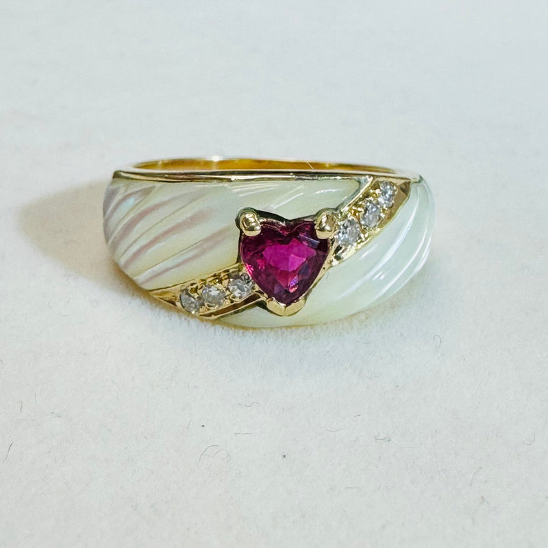 14k Yellow Gold Diamond Mother of Pearl and Ruby Heart Ring Size 7