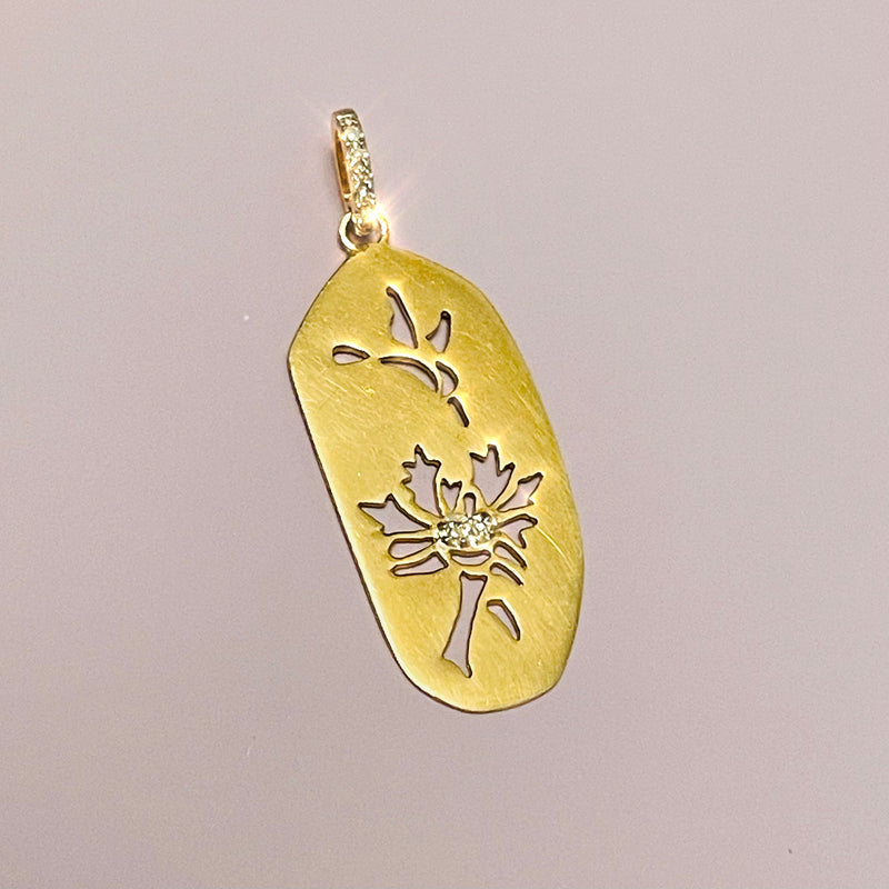 14K Yellow Gold Humming Bird and Flower Silhouette Diamond Pendant