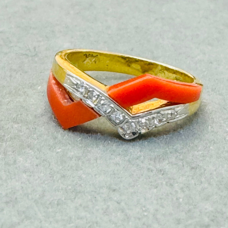 14K Yellow Gold Natural Mediterranean Coral and Diamond Avant Garde Ring Size 6