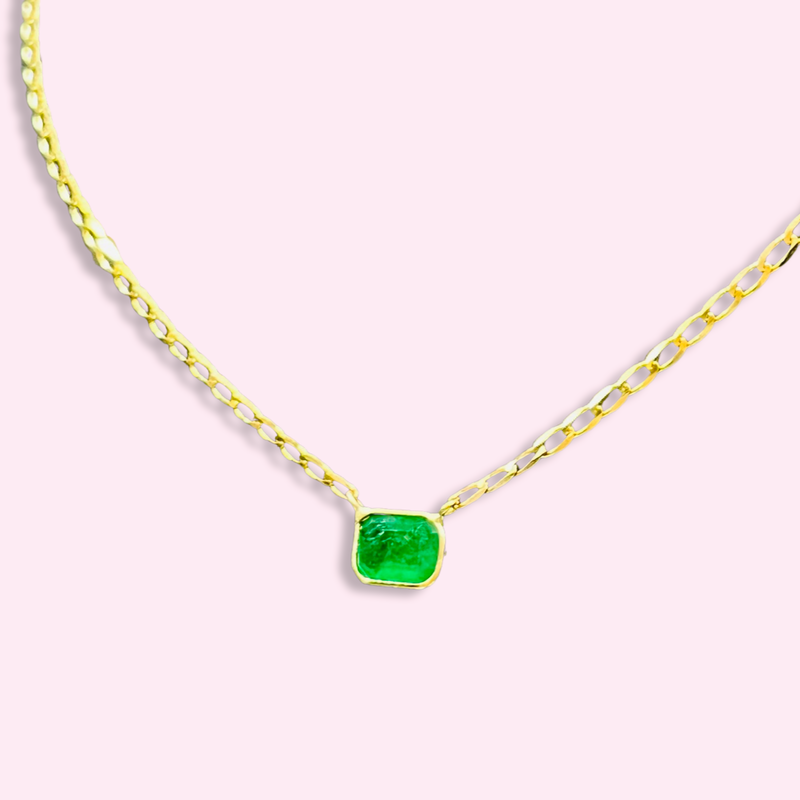 This is a one of a kind emerald cut natural Emerald stone featuring a dark green colored rectangular shaped emerald. The emerald itself measures 7mm wide x 6mm in height hanging from a 2mm Cuban link chain.