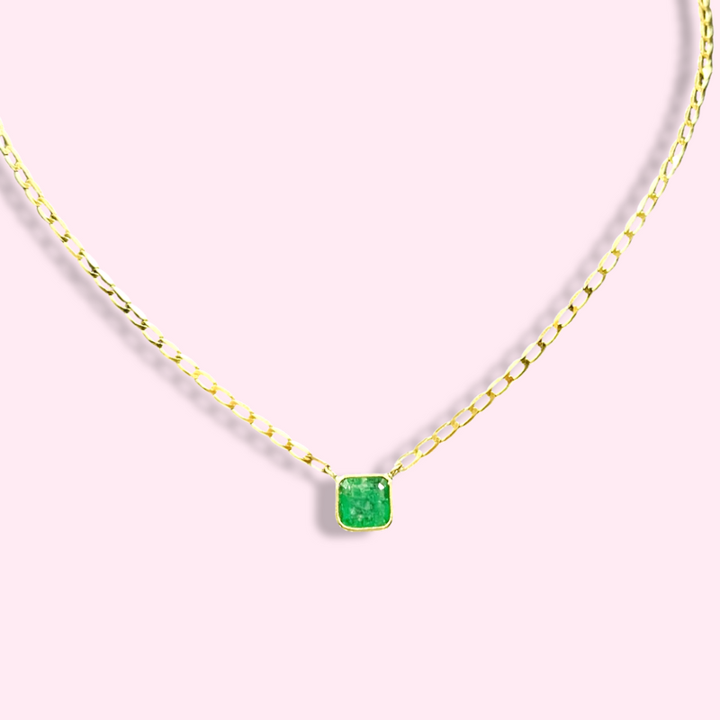 This is a one of a kind emerald cut natural Emerald stone featuring a beautiful green colored square shaped emerald. The emerald itself measures 6.5mm wide x 6.5mm in height hanging from a 2mm Cuban link chain at 18".
