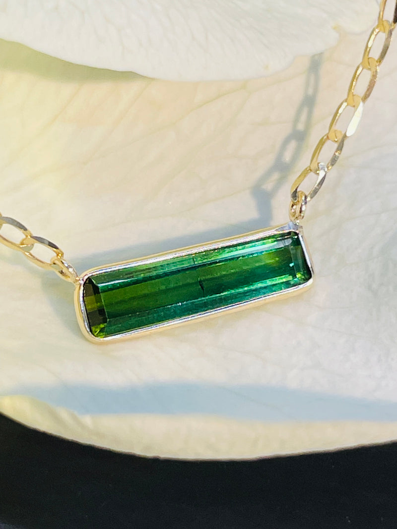 Featuring a 2carat of natural long emerald cut green tourmaline