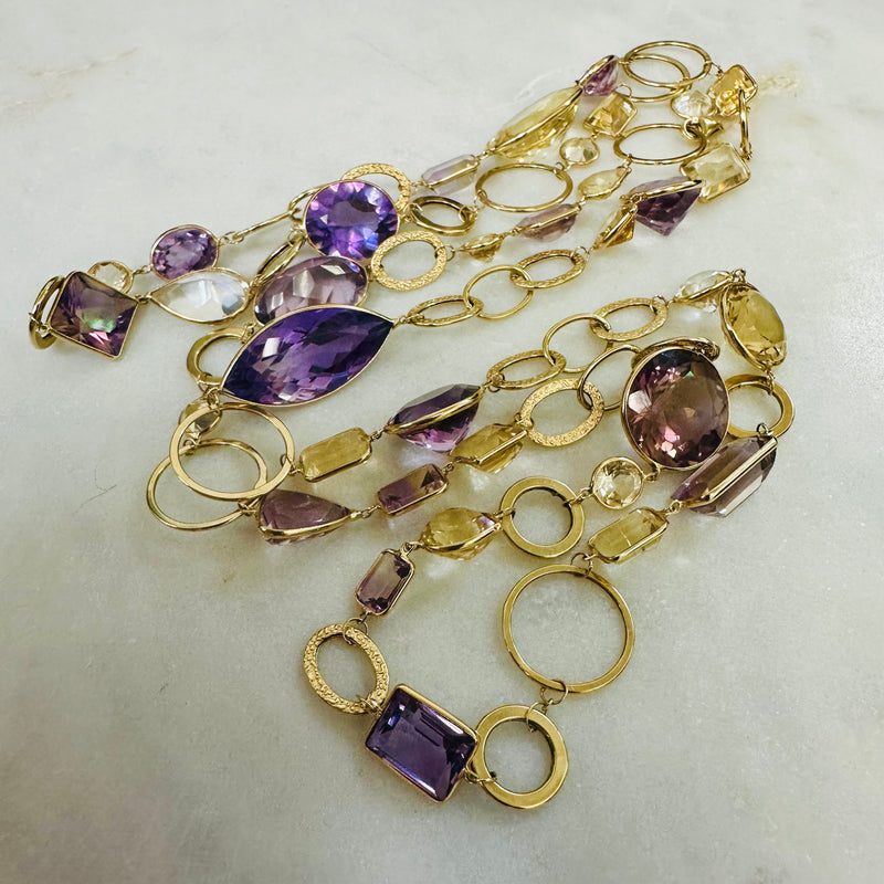 34" Long Solid 14K Yellow Gold Natural Multi Shape Amethyst, Ametrine, and Citri
