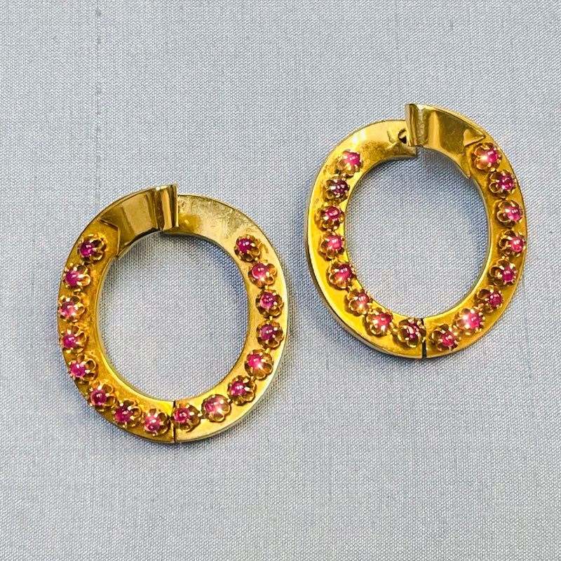 Amazing Natural Burma Ruby Cabochon Antique Victorian Hinged Hoop Earrings