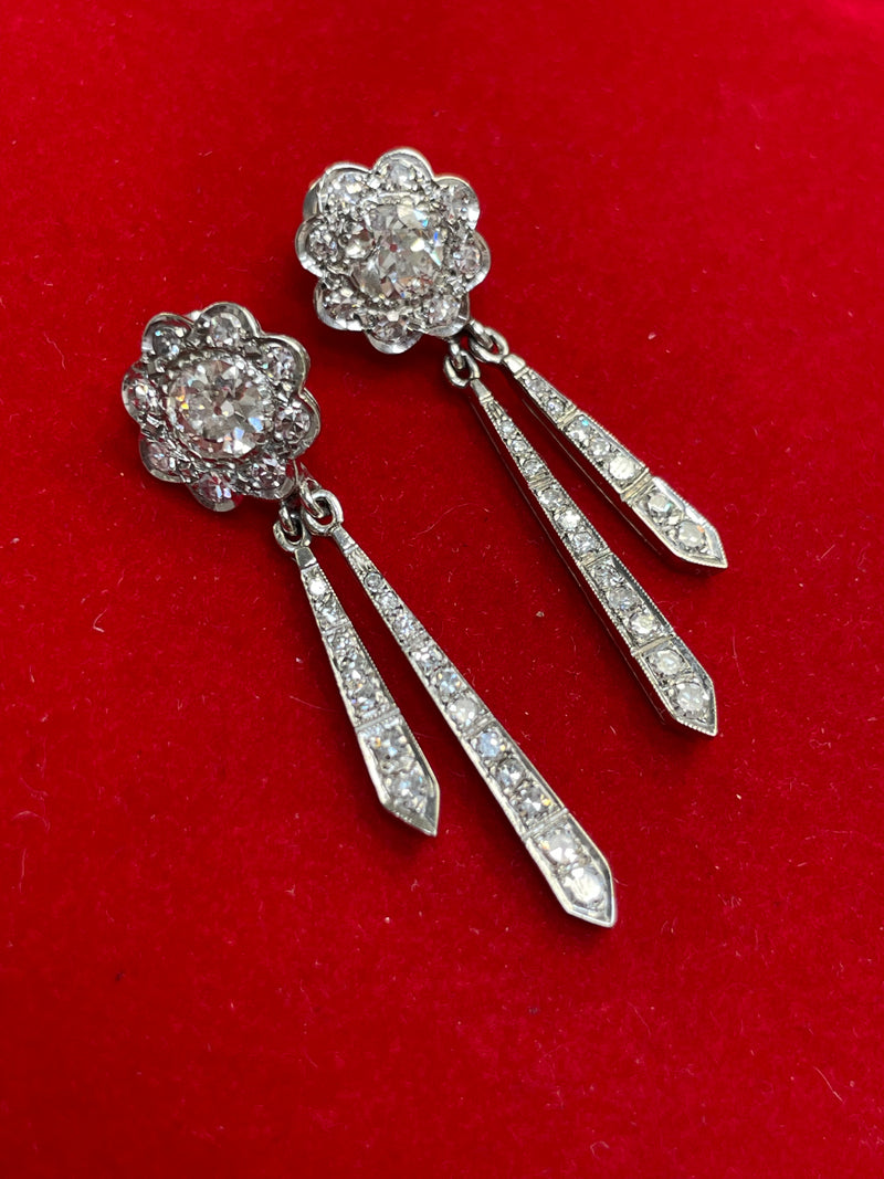 Art Deco 3.37CT Old Mine Cut Diamond Platinum Drop Earrings