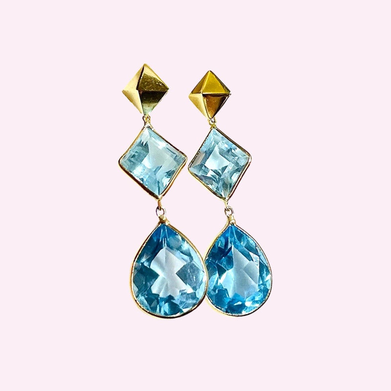 Blue Topaz Lozenge and Pear Shape Drop Earrings 14K Yellow Gold