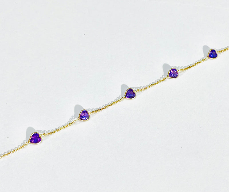 Natural Amethyst Sweet Heart Station Bracelet 14 Yellow Gold 6.25-6.75"