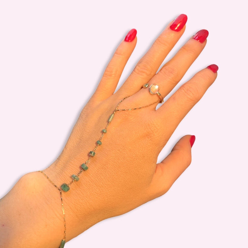 Colombian Emerald Bead Handchain 14k Yellow Gold