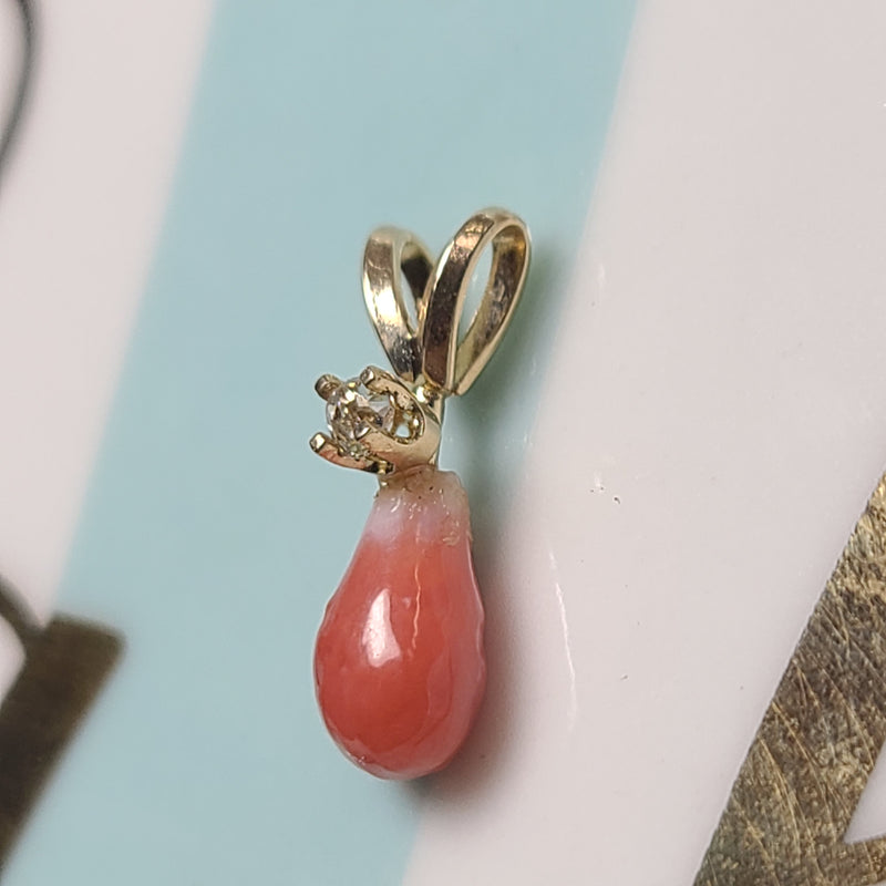 A beautiful Pinkish Orange conch pearl with hint of light and dark pink topped with a 2mm Diamond in prong setting held together with a 14K yellow gold bail.