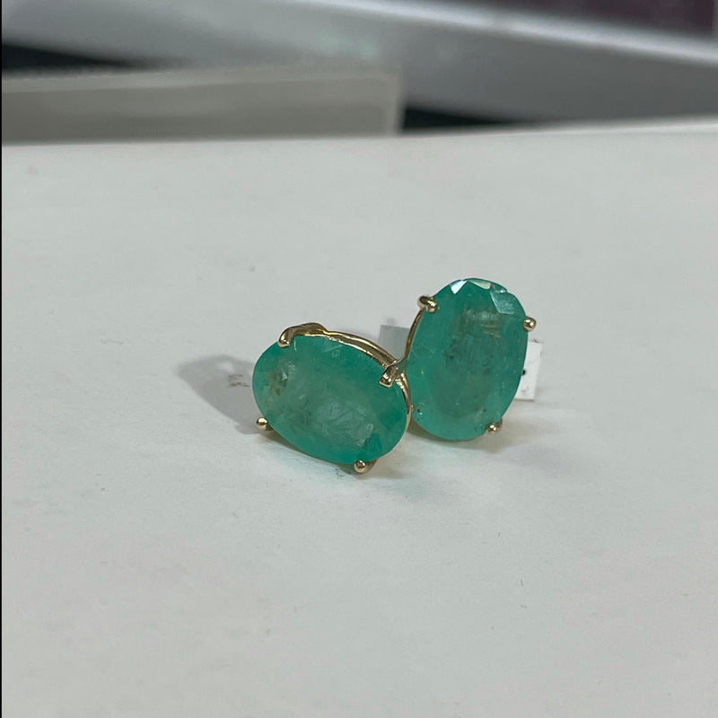 6CT Colombian Emerald Oval 14K Yellow Gold Stud Earrings