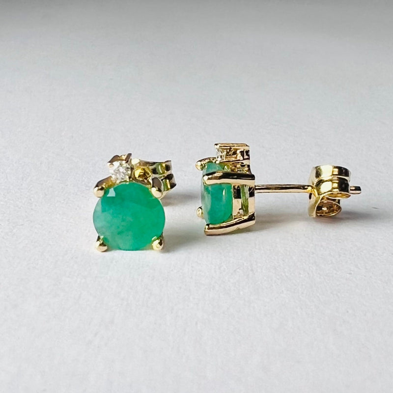Solid 18K Yellow Gold Emerald and Diamond Stud Earrings 6x4.5mm
