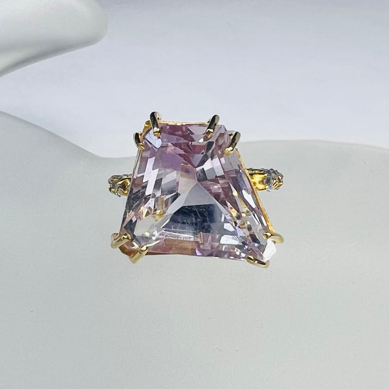 Large Tapered Kunzite prong set in 14K yellow gold sapphire set eternity ring band.