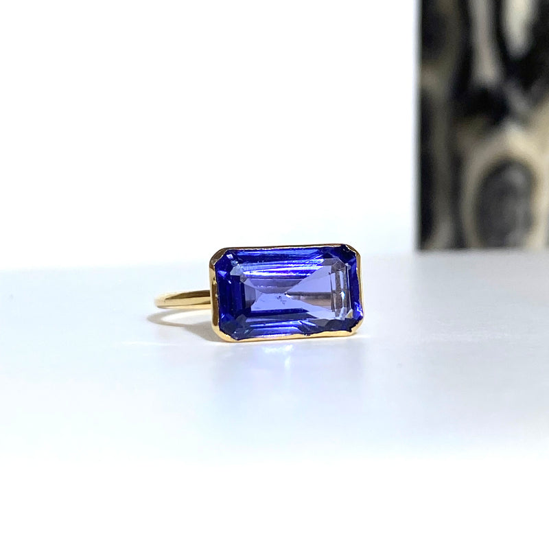 Featuring a natural and earth mined tanzanite, bezeled in solid 18K yellow gold on a rounded 1.5mm band.