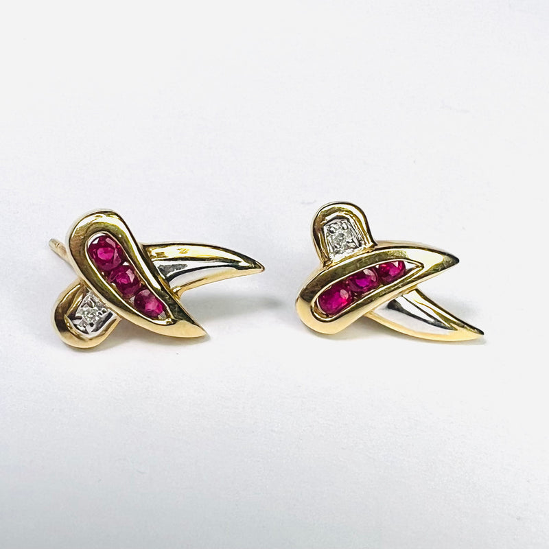 14K White And Yellow Gold .33ct Ruby & .01ct Diamond Cross Earring Pushback Studs 13x8mm