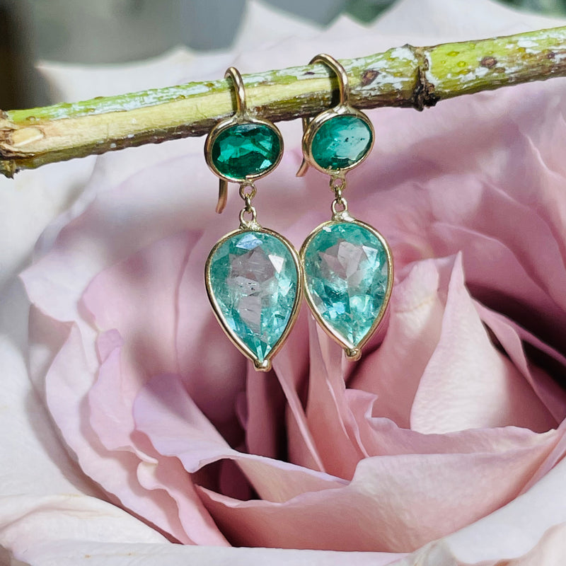 These gorgeous earrings are handmade with natual emeralds, pear cut, and oval cut.