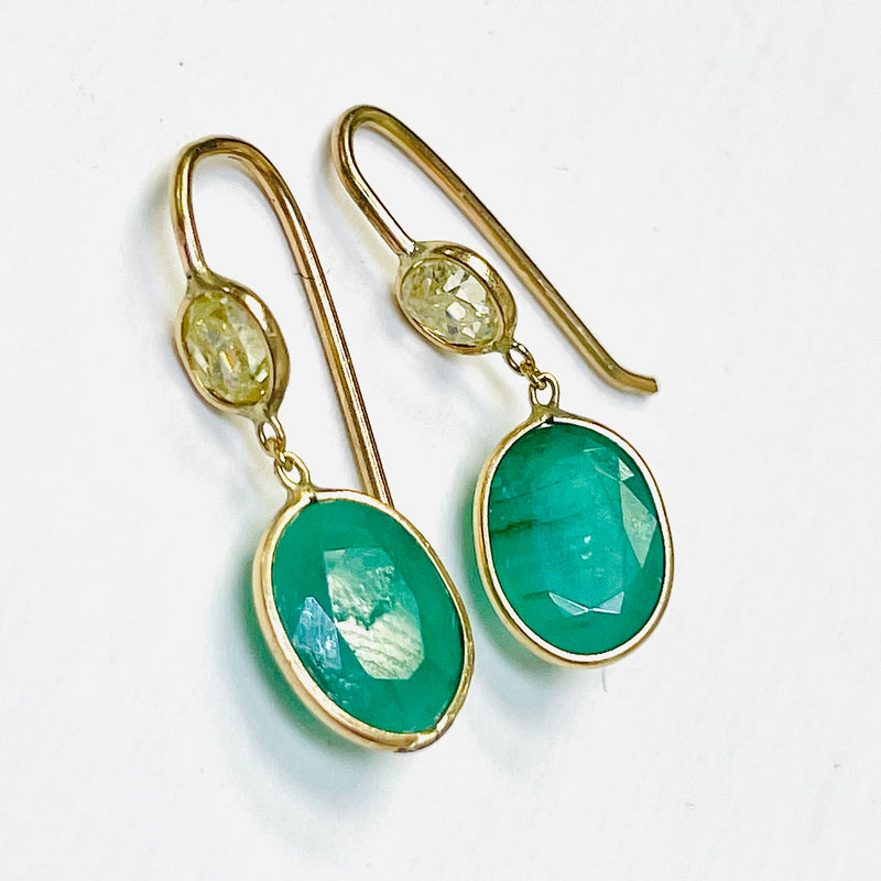 These gorgeous earrings are handmade with emeralds in an oval cut and fancy light yellow diamonds, delicately bezeled and surrounded by solid 14K yellow gold.