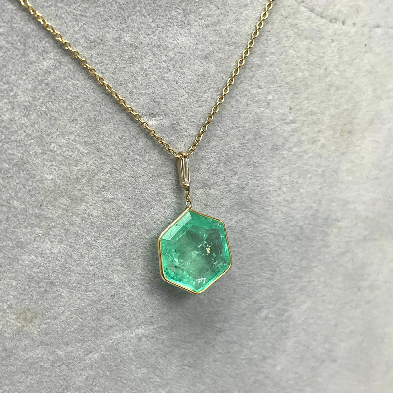 Made in Solid 14K Yellow gold, floating hexagon emerald bezel wrapped hanging from a tapered diamond bezel wrapped.