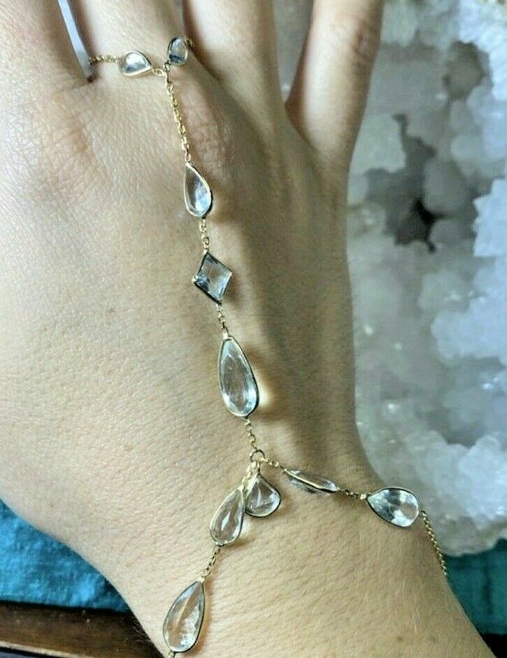Natural Aquamarine Solid 14K Yellow Gold HandChain Bracelet 7.5"