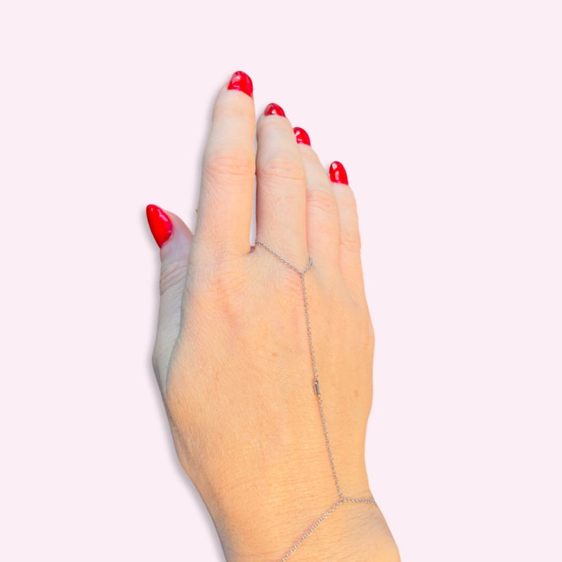 Crafted in solid 14K white gold, holding a natural baguette diamond suspended in a bezel to sit upon the top of your hand.