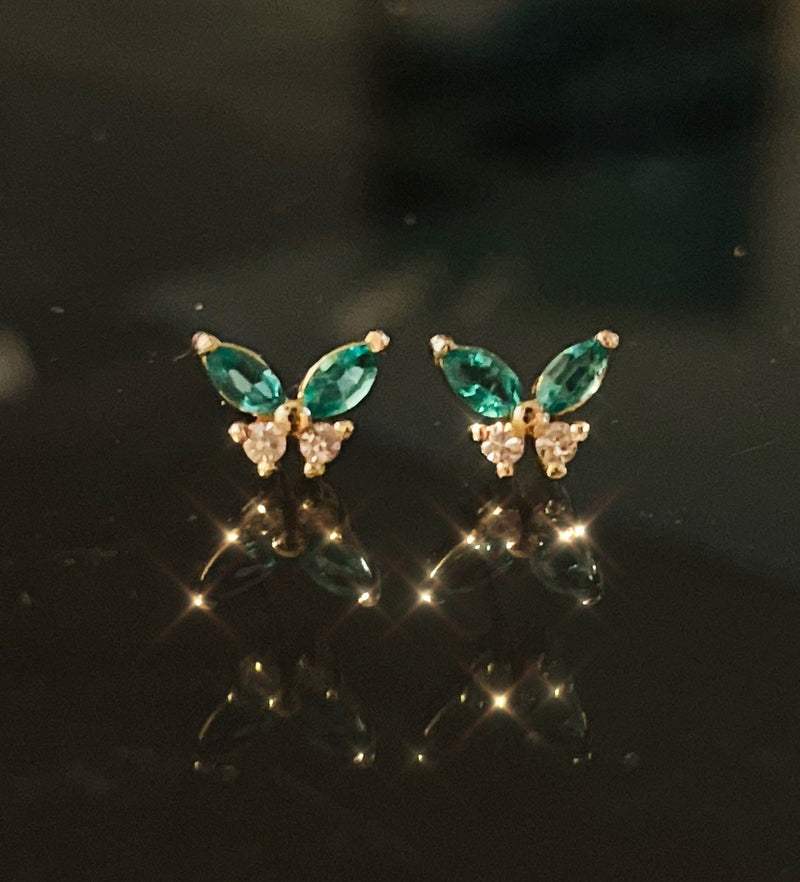 Natural Emerald and Diamond Solid 14K Yellow Gold Butterfly Stud Earrings