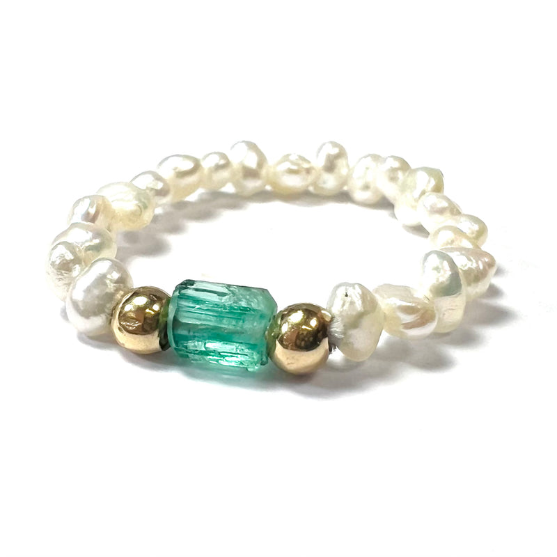 Featuring a 2.5mm seed pearl ring with natural rough emerald and yellow gold beads.