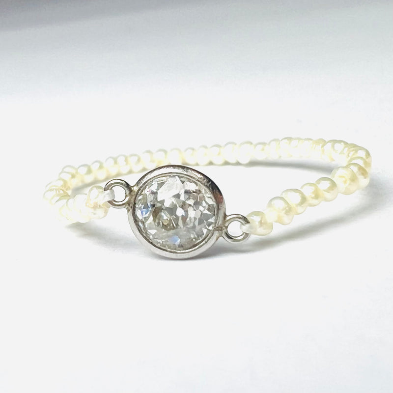 Featuring a 1mm seed pearl ring with .30ct white gold bezel natural diamond.