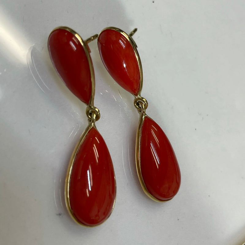 Natural Untreated Red Coral Drop Earrings 18K Yellow Gold