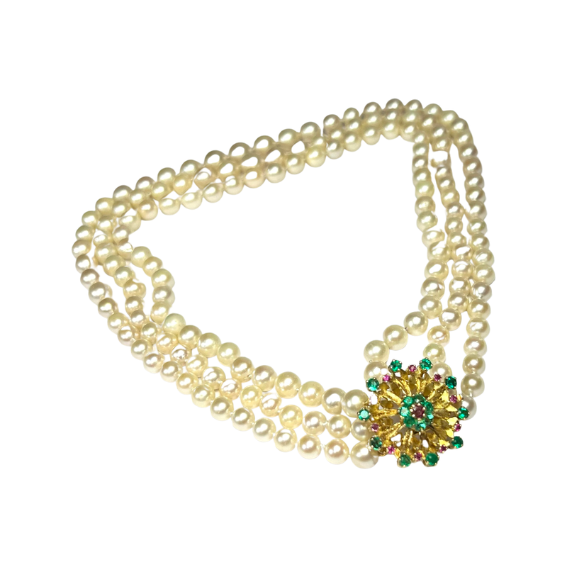 Pearls with Floral Emerald and Ruby 15" 14k Yellow Gold Necklace Sale price$2,614.06