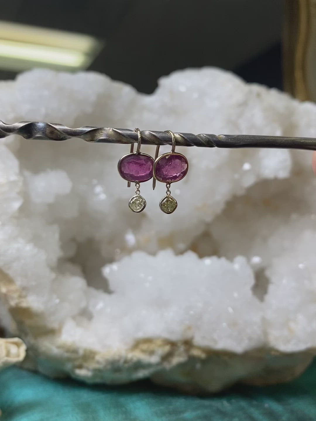 Oval Pink Tourmaline Yellow Cushion Diamond Solid 14K Yellow Gold Dangling Earrings Sale price$532.76