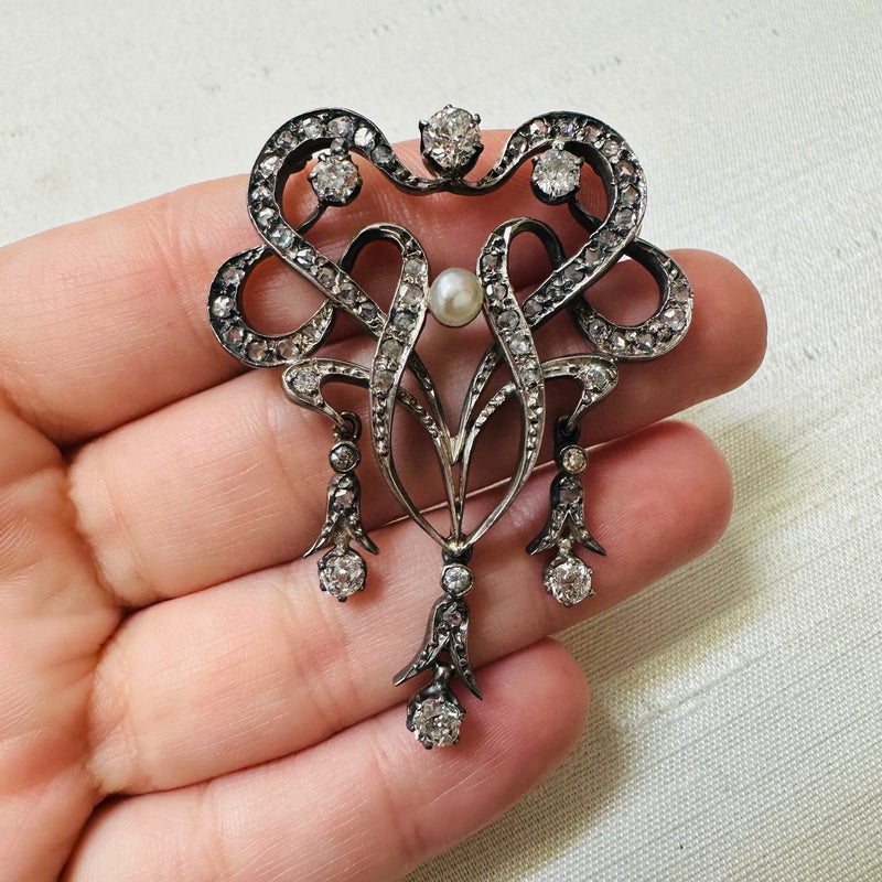 Crafted from both sterling silver and 18K gold, this alluring pearl and diamond brooch pendant weighs in at a delicate.