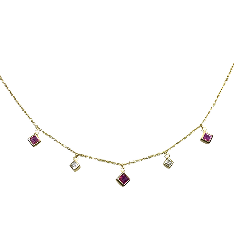 Princess Cut Ruby and Diamond 16" 14k Yellow Gold Dangle Necklace