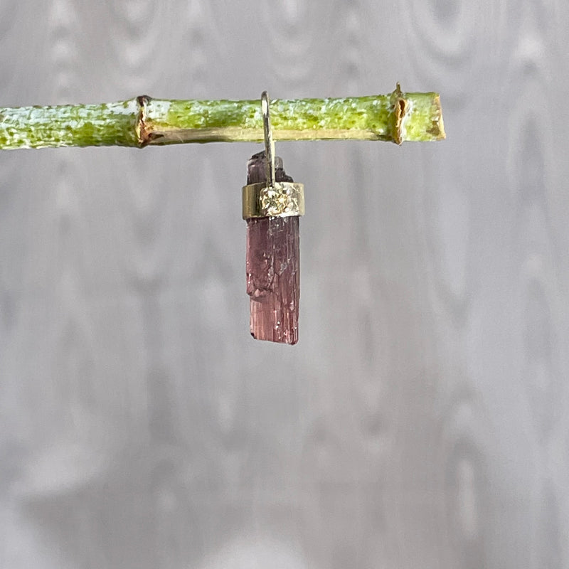 Rough Pink Tourmaline and Diamond 14K Yellow Gold Amulet