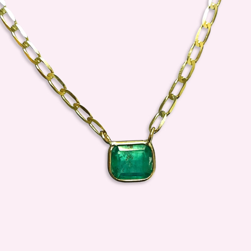 Solitaire Emerald 14K Yellow Gold Curb Chain Necklace