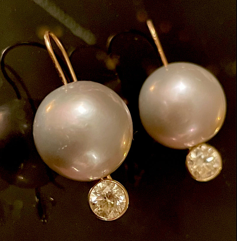 Stunning!14mm Freshwater Pearl and 1CTW Diamond 14K Gold Earrings