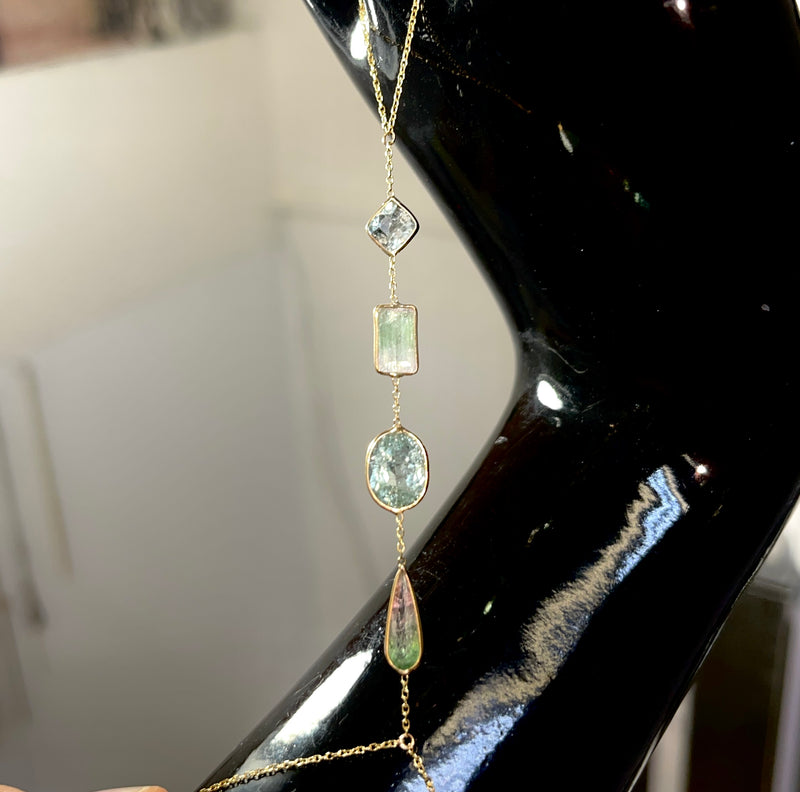 The tourmalines are natural and Earth mined, bezel wrapped in 14K yellow gold, and floating at the center of a hermes link chain.