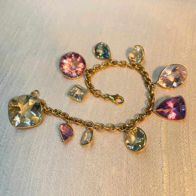 Treat yourself to a burst of soft sweetness with our Therapeutic Pastel bracelet! Featuring natural topaz, kunzite, and amethyst gems in light pink, purple, green, and blue hues, this 14K yellow gold charm bracelet adds a touch of natural beauty to any outfit. (Indulge in a sugary treat for your wrist!) 15.7g