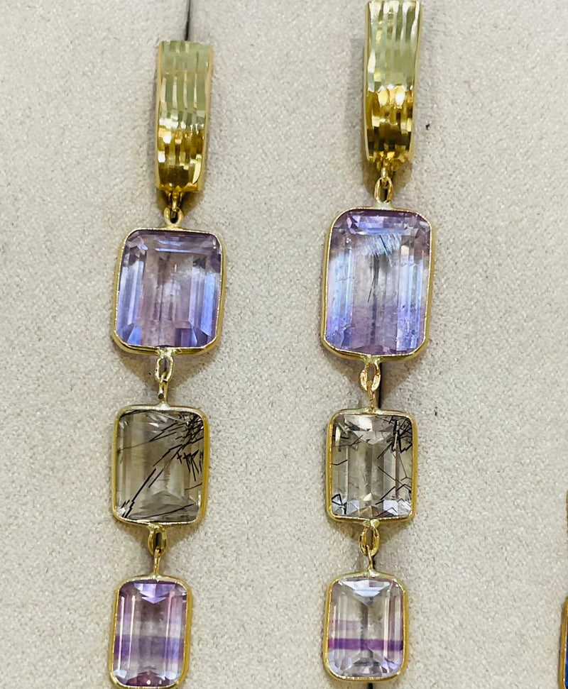 Rutilated Quartz and Striated Amethyst14K Yellow Gold Drop Earrings