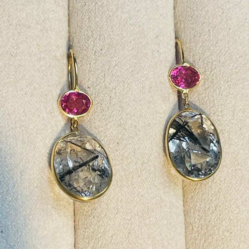 Tourmaline and Rutilated Quartz 14K Yellow Gold Drop Earrings