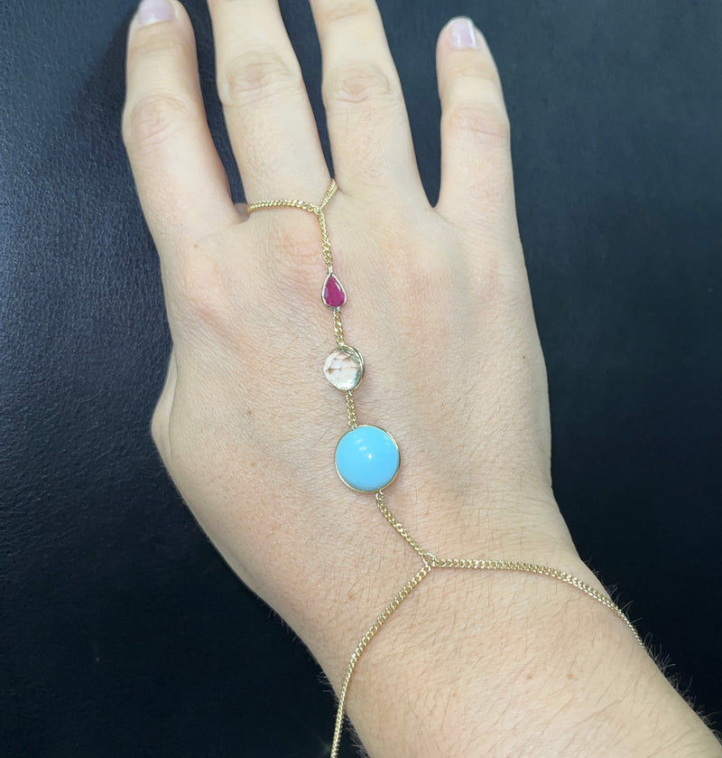 Turquoise Green Amethyst and Ruby Solid 14K Yellow Gold Hand Chain