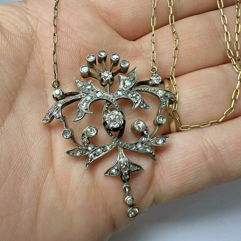 Victorian 14K Gold Old mine & Rose cut Diamond Filigree Pendant Necklace 19" Sale price$4,378.17