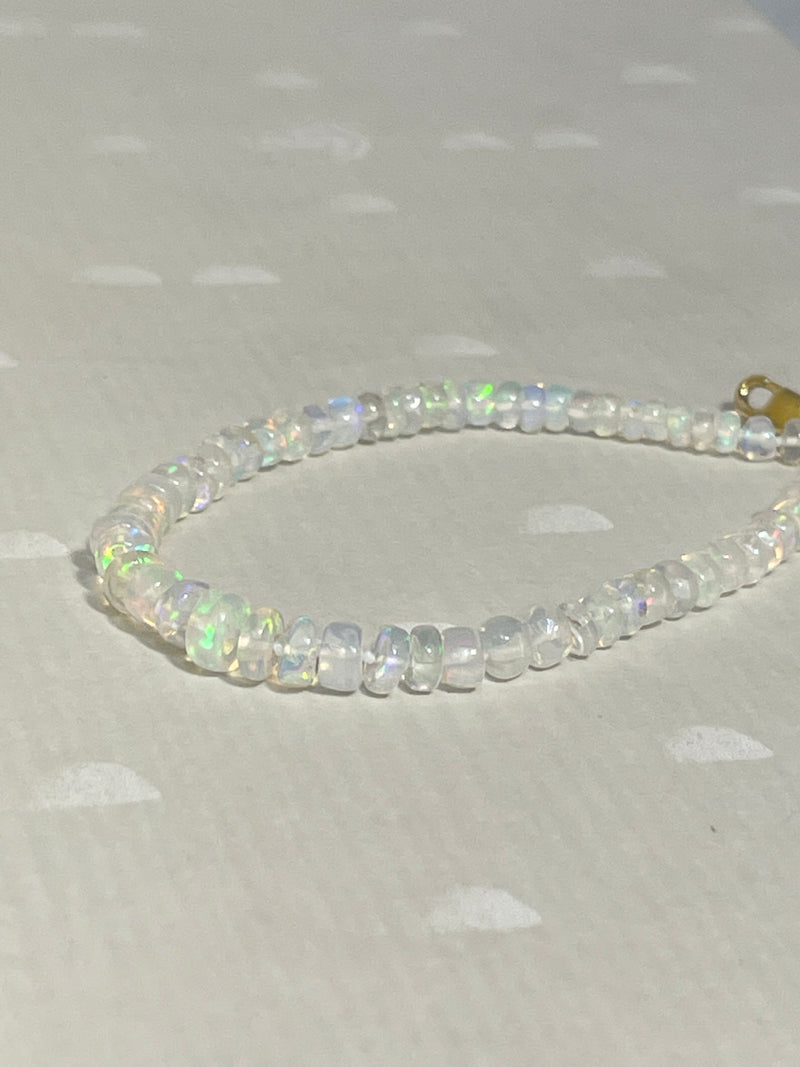 Featuring a natural and untreated white opal beaded bracelet with a 14K Yellow gold clasp.