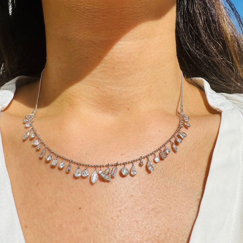 This exquisite 14K white gold necklace showcases a breathtaking arrangement of varying diamond shapes , gracefully suspended from a 17" chain. It's a gorgeous and refined addition to any jewelry collection.