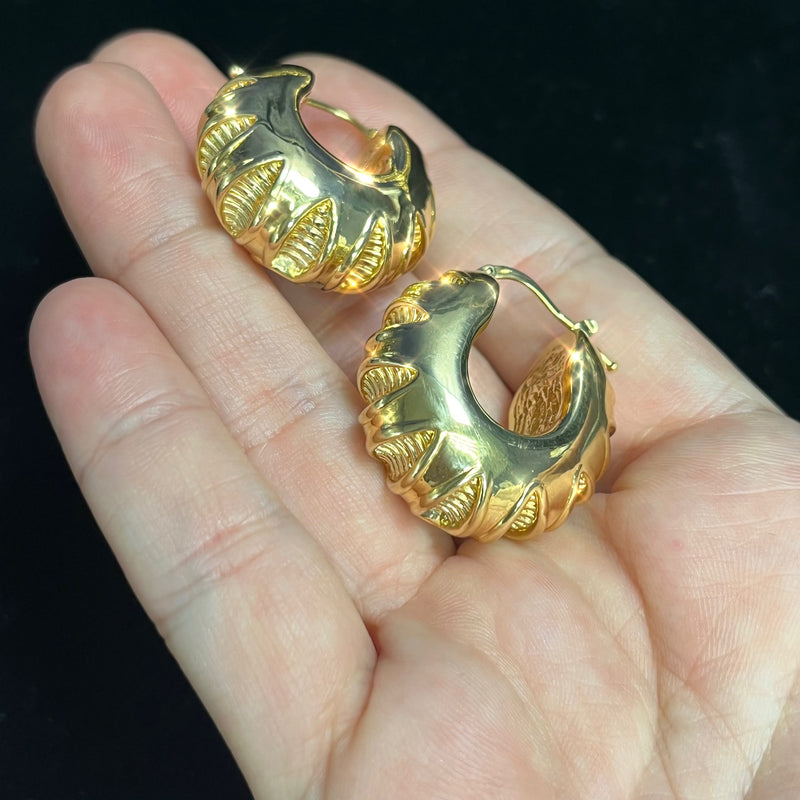 Italian hollow electroformed 14K gold hoop earrings.