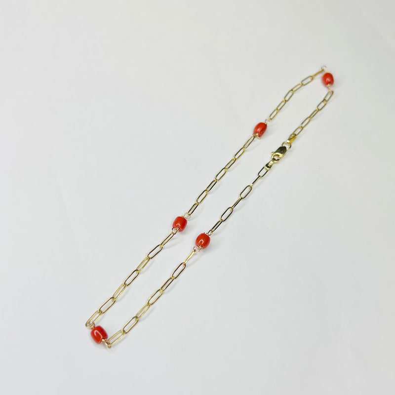 Solid 14K Yellow Gold Coral Beads Station Paperclip Anklet 10.5"