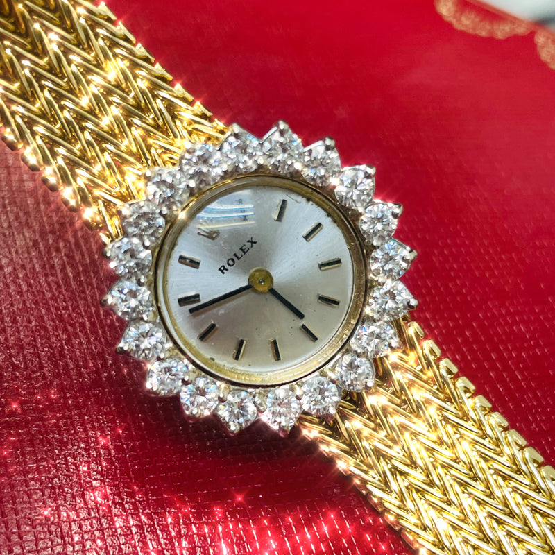 25mm Vintage Ladies Rolex Wristwatch with Factory Diamond Halo Bezel in Solid 14K Yellow Gold